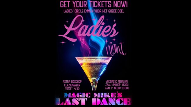 Lees verder!Maak je klaar voor een zinderende Ladies Night met de film MAGIC MIKE’S LAST DANCE 🤩 georganiseerd door Ladies’ Circle Emmen voor het goede doel. Bij de ticketprijs inbegrepen; Welkomstdrankje…